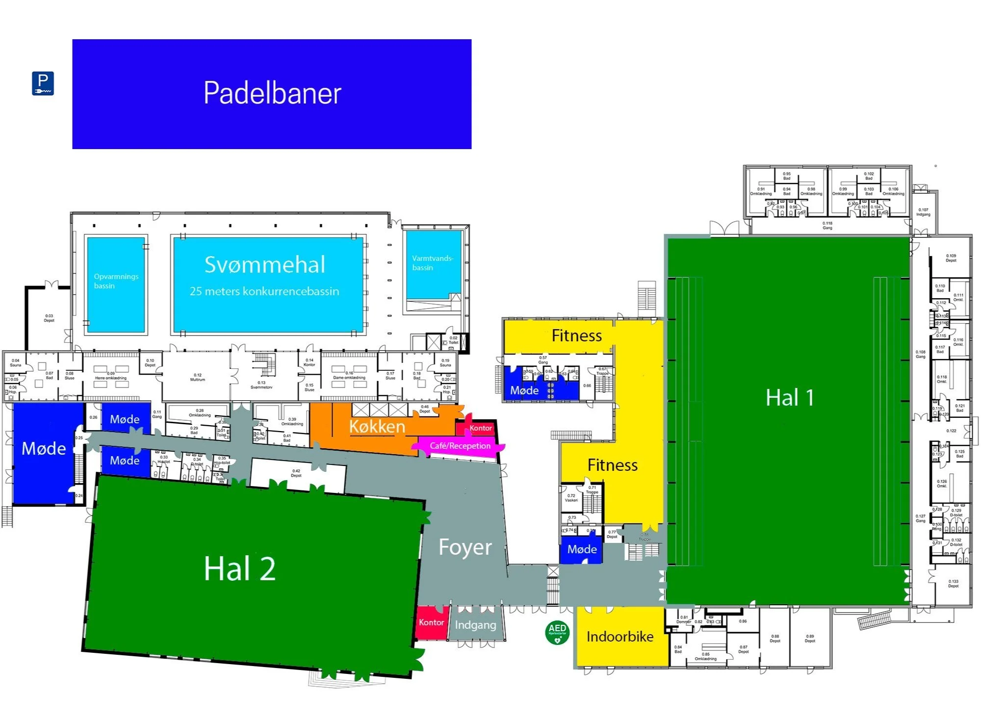 Der er ophængt en hjertestarter udenfor hovedindgangen, så den er tilgængelig 24 timer i døgnet. Placeringen fremgår af ovenstående plantegning, og samtidig er der tydelig skiltning i hele idrætscentret.